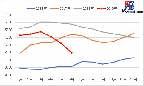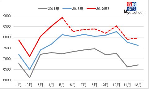圖3:2017-2019年全國粗鋼月產(chǎn)量(單位:萬噸)